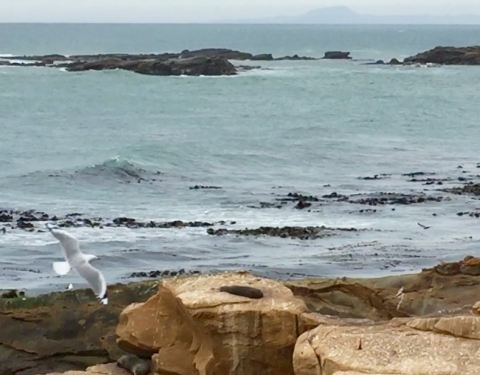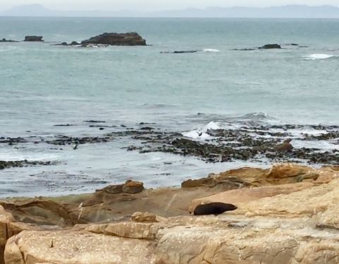 Shag海角自然保护区在Shag河的入海口处,因为是保护区所以没有步道,意味着你胆大可以深入到海滩,但是对于野生动物的安全接近距离有一个警示。 岩石上黑色的就是海豹了。