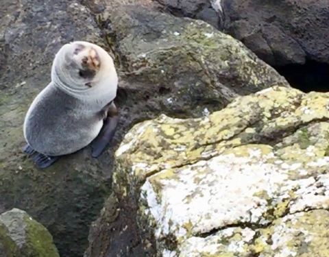 在shag point nature reserve的凛冽海风下,小海豹豪不惧人略有些好奇,躲在突起岩石后收拢成一团避风晒太阳。