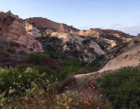This is an easy canyon hiking trail in the Whiting Ranch Wilderness Park. At the end of the trail, we were rewarded with a scenic view of multiple "red rock" formations. The red rock formations popped in a series of striking pinkish-to-red hues.