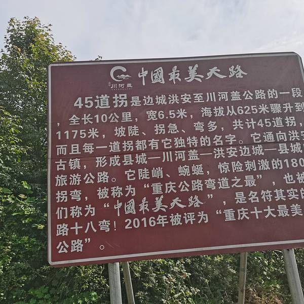 川河盖风景区距离洪安边城55公里,路况一般,走了近两个小时,45道拐连接洪安古镇和川河盖景区。此段公路全长10 公里,海拔从625 米骤升到1175 米,坡陡、弯多、拐急,共计45道,堪称“重庆公路弯道之最”,被称...