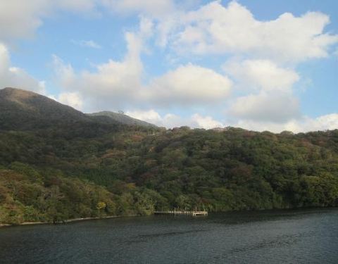 ...的鸟居从水里冒出来,它是箱根宫门的门,这是一个小小的神道圣地,藏在树林中,武士在这里停下来祈祷