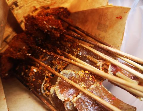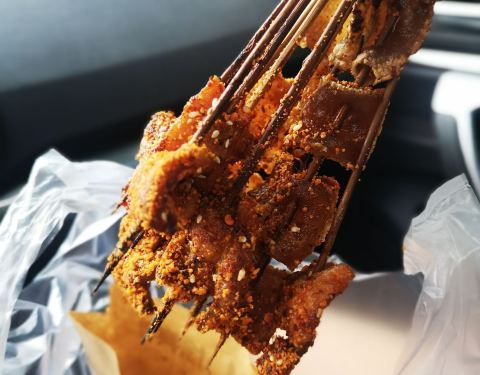 这家店在建设路小吃街也挺多年了,以前生意好的不得了,排很长的队,现在可能是吃的选择太多了吧,排队人没那么多了。买了一份把把烧和猪皮。把把烧挺好吃的,佐料也到位,刚烤出来吃着很香。猪皮要吐一下槽,刚刚烤出来还勉强能吃,虽然已经有点太筋道了,稍微等了5分钟以后再吃就已经味同嚼蜡了,完全咬不动感觉已经不是猪皮的质感了。