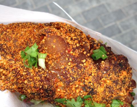 第一次吃烤的猪蹄,非常美味。在路边吃也没觉得不雅,在我吃的过程中也是排起了长队。人气很旺。老公回家自己试了一下,味道差不多,很容易做,现在已经成了烧烤必备项目。