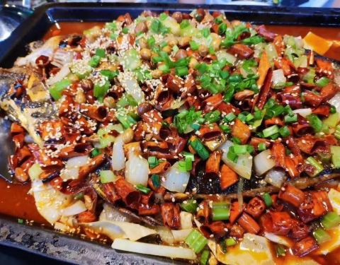 疯鱼军团餐厅以烤鱼为特色,腌制入味的鱼肉在香辣的调料里沸腾,激发出诱人的香气。餐厅的烤鱼口味丰富,有麻辣、香辣、海鲜、蒜蓉等。