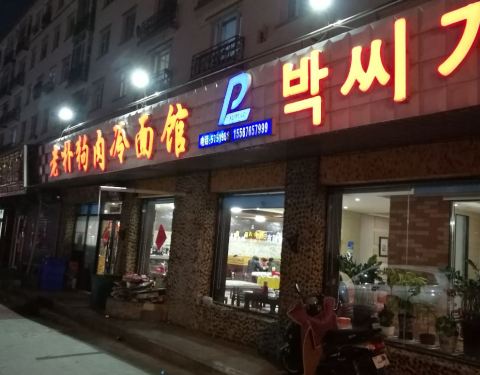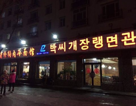 老朴狗肉冷面馆,所处的地段很好,就在主干道上,招牌很醒目,尤其晚上霓虹灯一量更加显眼。饭馆室内装修在周边餐馆来说,算是相当不错,干净整洁,因此第一印象不错。服务也算热情。 可能有很多人不喜欢吃或者不愿意吃狗肉,其实这里除了狗肉以外,其他的菜品也算是味道正宗,价格实惠。一家朝鲜风味店,辣是主要特色,辣白菜炒土豆片、辣炒年糕、辣白菜五花肉。主食冷面是他家的招牌、土豆饼也不错的,多春鱼豆腐汤也不错。总体来说是值得推荐的。