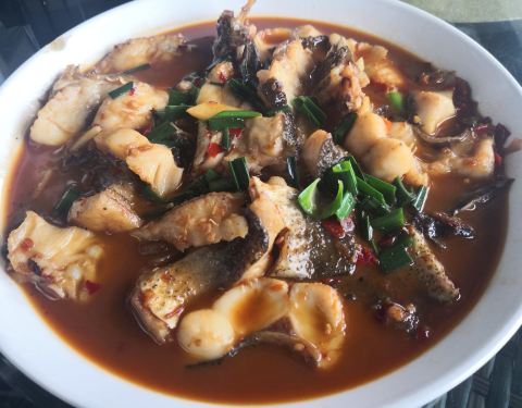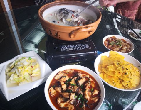 临湖而坐非常好,一边看美景一边吃饭感官绝对赞到无懈可击了。 自己随着老板去外头鱼缸撩鱼称重一鱼两吃,除了这鱼顽强的生命力一直在蹦哒把我吓一跳其他很完美的,湖鲜就是好吃。