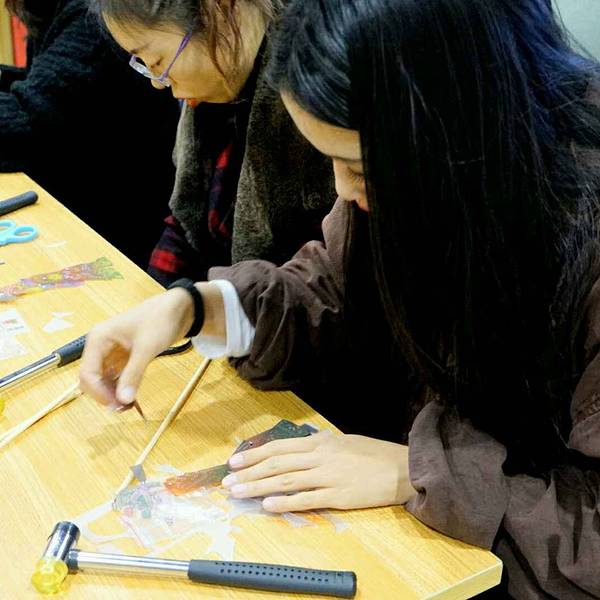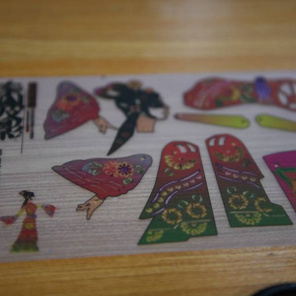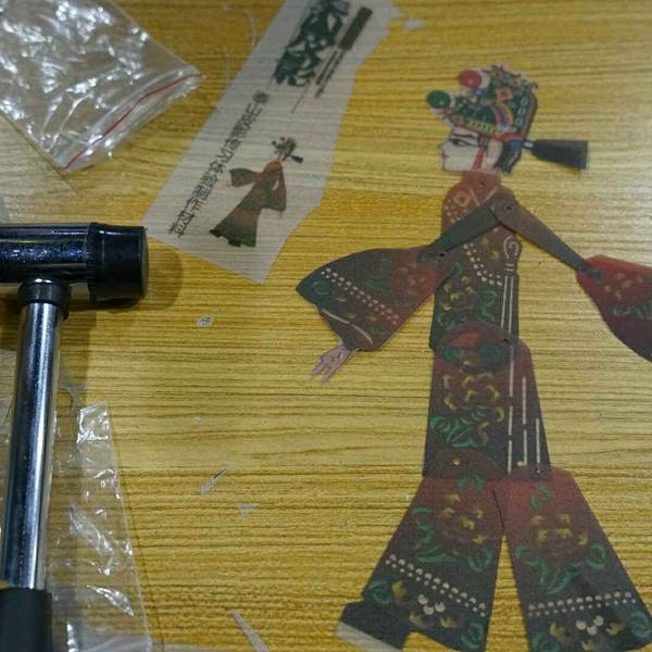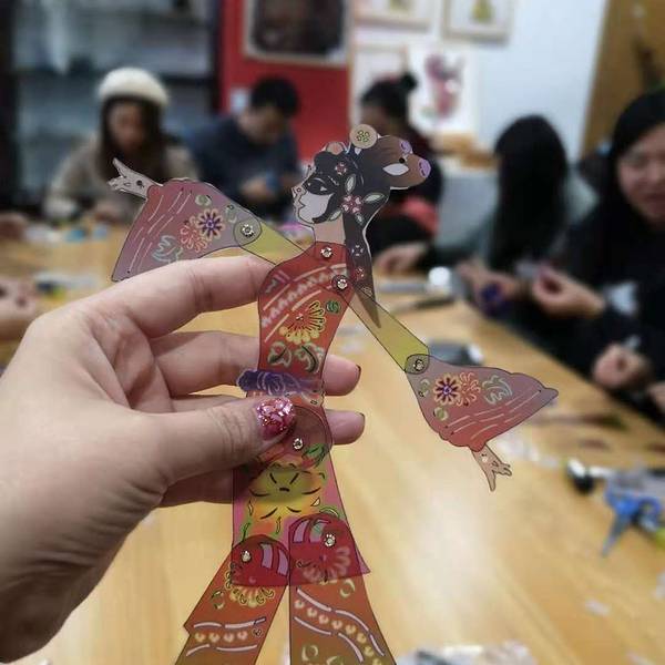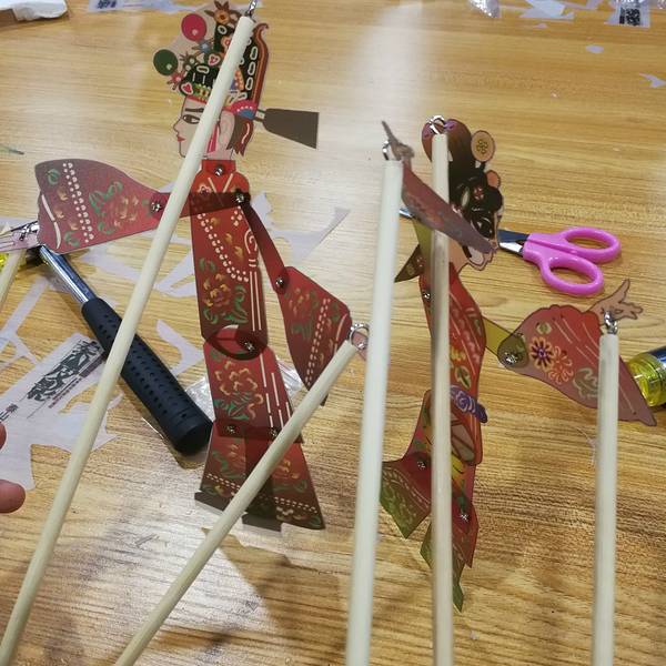 看完皮影戏还可以亲手制作皮影人偶,一对才子佳人的组合,驴皮什么的真的不敢用好么,一张PVC板就当练练手吧。顺着人物外沿裁剪下来,用钉子和铳子,再加个小锤子,把人物的关联位置钉起来,不能砸到底呦,拿起来晃悠晃悠保证各部位都能灵活转动才行,否则僵硬的关节就只能做个万圣节主题了嘿嘿。最后拿着竹签子与两只手和头部的孔穿在一起,拿着竹签你也可以试试让人物动起来,随意摆个pose的感觉啦。自己试了试,两只手一个人物我都没法让他像个正常人一样走几步路,手不知道该怎么放才好,想一下老师傅们用两只手摆弄二个人,是怎么做到的呢? 展开
