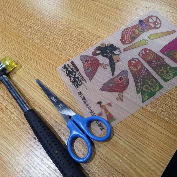 看完皮影戏,还可以做一个自己的小皮影来表演。自己制作的皮影不是驴皮的,使用塑料制作的简单皮影。