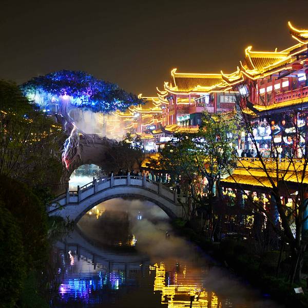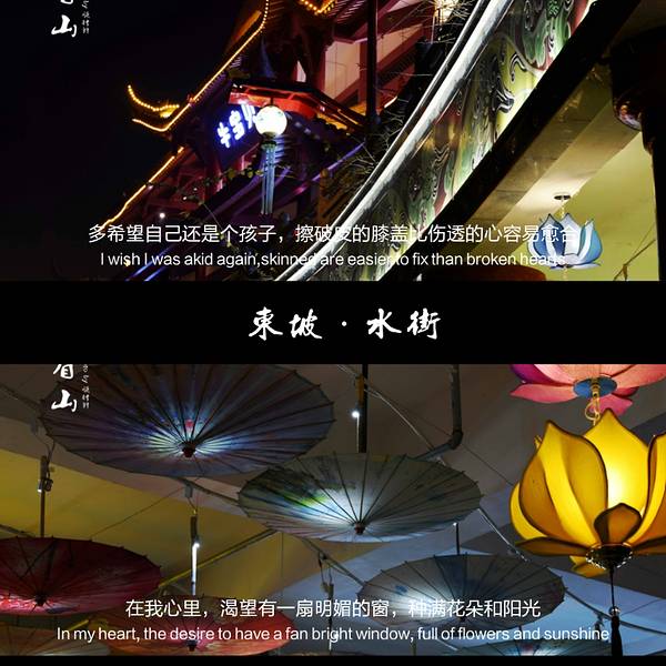 在距离成都市仅70余公里的眉山市中心城区,有这样一段被网友誉为“四川版大唐不夜城”的水街,整条街以滨水风情为蓝本,东坡文化为内涵,宋代古韵建筑为载体,苏州园林景观为原型,体验式旅游商业为核心,一处处的梦幻场面让人感觉穿越千年的旅游商业风情街。眉山水街分为东坡印象水街、穿越城水街、东坡里水街三个部分,全长约1500米。目前穿越城水街还有一段未建成,全部投用后,水街总长度近2公里。其中东坡里商业水街是苏东坡被贬时的落脚点,也是比较精华的一段,整条街古风建筑鳞次栉比,湖水环绕,白天是徒步、休闲的好去处,晚上是看夜景、看灯光秀的好去处。每当夜幕来临,华灯初上,整条水街繁华的商业街与风情客栈相搭配,蜿蜒曲折,移步换景,点缀其间的亭台楼阁、白玉拱桥和泛着光亮的树,让整个水街灯火通明,绚烂无限,成为四川新晋“网红打卡地”。如果不是身临其境,也许你不能想象和理解它的火爆程度,尤其是节假日,游客行走拥挤,吃饭也要等很久,尤其是停车位超级难找,所以纯粹奔水街去的强烈建议打车前往,以免找不到停车位而苦恼。我是顺时针,一个爱旅行爱摄影爱打卡的大龄青年,旅行是我生命中的必修课,是我生活不可或缺的一部分,我爱随性随意的随拍,也爱分享我的旅程心得和体验,如果你觉得我的笔记有帮助到你,请随手给个赞鼓励哦。