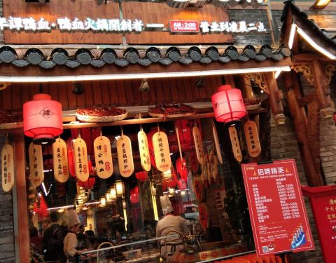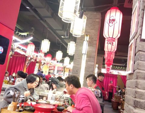 - 排队排到天荒地老,四川市井火锅的风格,大红灯笼,红木漆桌椅,处处彰显着喜庆感 经典谭鸭血红锅:78米