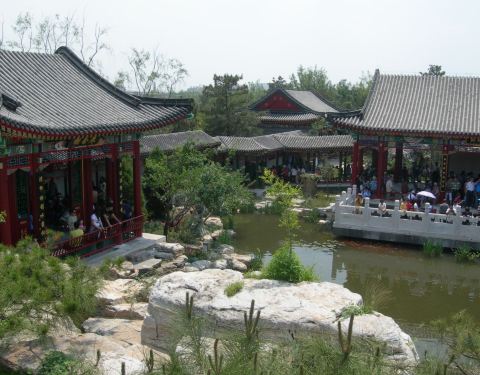 红墙、黄瓦,伴随着京剧的声音,这就是北京园。北京园是所有省市园中占地面积最大的园,为5350平方米
