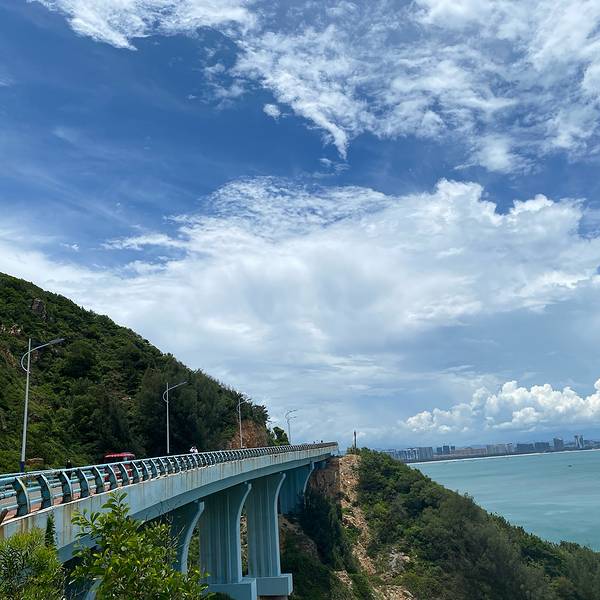 这条路位于福建省漳州东山岛苏风山环岛路,2016年才通车的,如已经是一条小有名气的网红线路了,而位于苏峰山这一段的沿海公路,更是因为风景秀丽,以及这座治愈系蓝色大桥而成为很多人特意驻足的拍照点~ 这边的海水特别蓝,阳光照耀下波光粼粼,特别是傍晚夕阳落在整个山头与海边的时候,超级美,特别适合来兜风~
