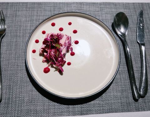 厚切澳洲雪花牛腰排低温慢煮后的牛肉,表面微微焦香,上乘食材的品质无需过多的作料,咀嚼在口腔里肉质的鲜甜口感和余味最磨人。 ⭕低温72小时牛舌用心之细,甚至餐盘都像是艺术品,绝不糊弄。在这儿,单凭食物和...