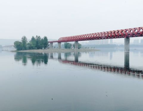 是清澈无比透明可见底的汉江河,河边走过红色的步行桥有名叫沧浪洲的湿地公园,面积很大草木繁盛, ...