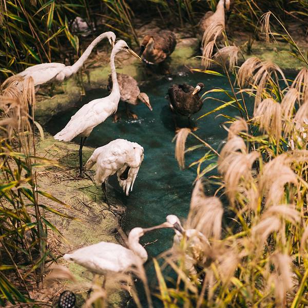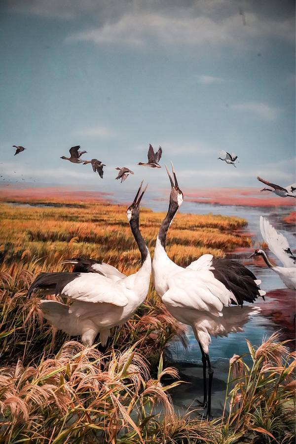 在工作人员哨声的指引下,自由飞出鸟笼,并且飞出优美阵型,场面十分震撼。众多鸟类标本。喂食丹顶鹤