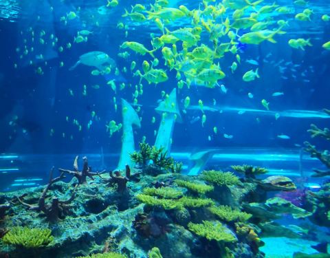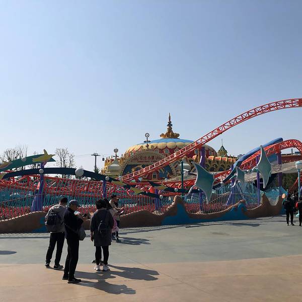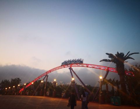 一进园区大门就能看到海豚过山车,听着刺耳的尖叫声很刺激,车子会经过鲨鱼嘴巴。一方面要排队,另一方面有点害怕,所以没去玩。