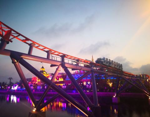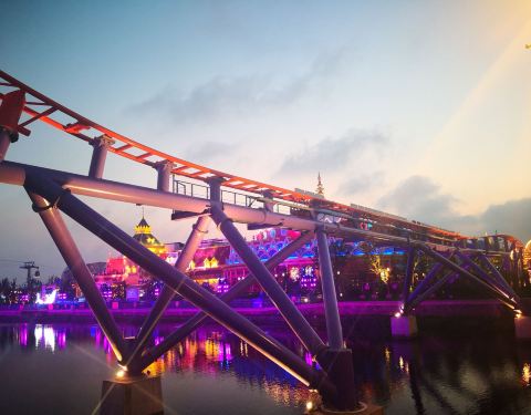 上海海昌海洋公园坐落于上海浦东新区临港大道上,整个园内最刺激的游乐项目非海豚过山车莫属了。在跨河而建的过山车上可以俯瞰整个园区,不过我只顾着尖叫和闭眼了,没敢看。