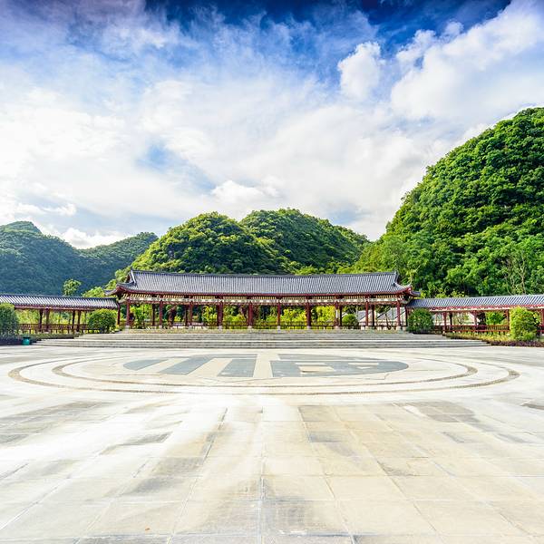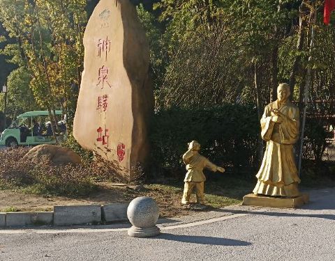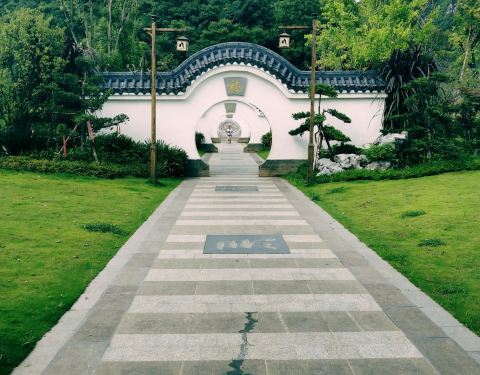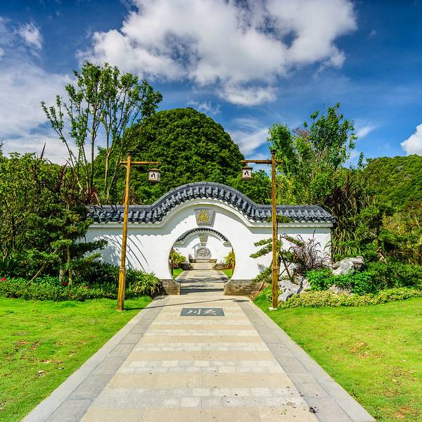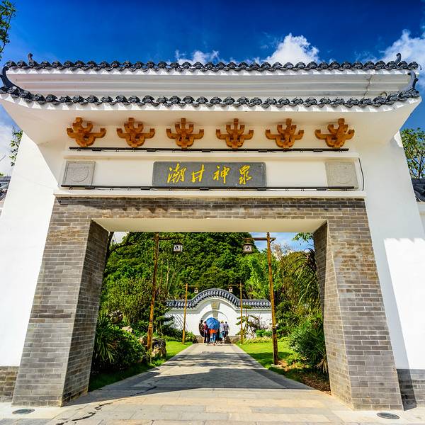 潮井核心区导览图集散广场,正对的门走到最里面便是潮井。广场的一边是各种美食小吃的售卖摊。第一道门,潮井神泉。然后在绿地蓝天之间一条小路,中间要经过几道拱门,过了拱门后是“顺”字广场,广场以书法体的顺字作水系,水系与不远处的潮井相连通。这是站在潮井的桥上看潮井的样子,图片中的时刻是涨潮的状态,在退潮时,地面很有可能是全干的。如果在这里你只停留片刻,不会看到潮有任何变化。甚至会对人们说它的神奇产生质疑,因为你看不到喷涌而出的泉水。而如果你在一天中的不同时刻到这里才能感觉出它的神奇。而无论你看到的是涨潮还是落潮都有它的彩头,涨潮禄,退潮禧。潮井桥的一侧小路有连廊可以通往另一个广场——福字广场!福字广场的东侧正对着的是玉带桥。碧水青山秀美的景色大家随意感受一下。湖岸比较长,然而这才是景区的一小部分区域而已,所以除非你想在这里玩水上项目不建议停留过长时间。离潮井核心区不远处是一处瀑布景观。瀑布的旁边有一排很古风的亭子,近处的亭子也是瀑布的观景台,可以到达瀑布出水口的顶端不远处一片薰衣草的海洋,亭台楼阁置身其中仿佛来到了世外桃源。亭下奔流不息,清澈见底的小溪水,这里是一处绝佳的采风景观,穿上古装,一下子穿越回到古代。乘坐电瓶车继续前行,我们绕到了刚才瀑布的后面,这里有另外一处风景绝佳的地点——画家村。