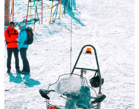 采尔马特滑雪场就在马特洪峰边上。坐火车上去,然后没有装备的人去租赁装备,穿好滑雪服的人直接去滑