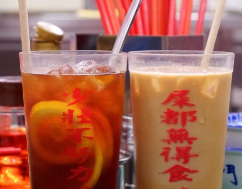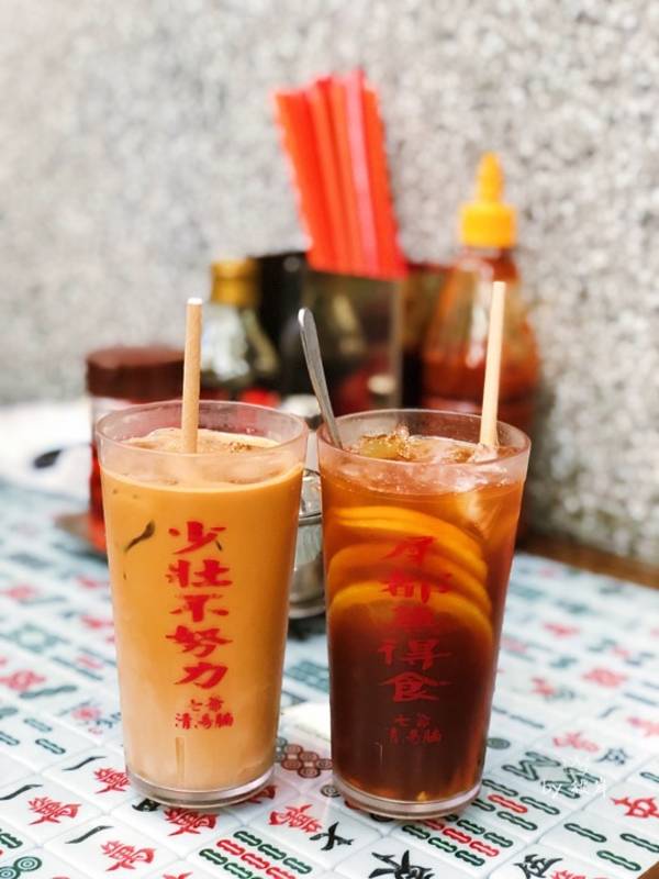 港式冻奶茶 和 冻柠茶 都不错,冻柠茶要搅和一下再喝。冻饮杯子上的字也太好笑了吧:少壮不努力、屎都無得食。呃,说得好有道理的样子。