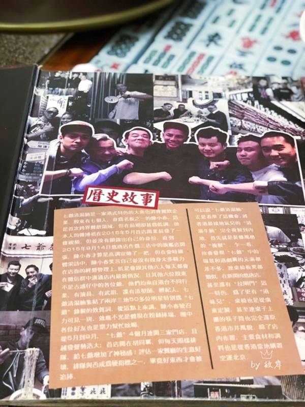 陈小春的七爷清汤腩,刚开业时也一度是网红店呐,现在热度慢慢降下来。但就餐时段也是满座。 店里布置得就像香港的茶餐厅一样,桌子下面是麻将牌,还蛮有趣的。墙上悬挂着舞狮头,还有古惑仔里的“义”字。 七...