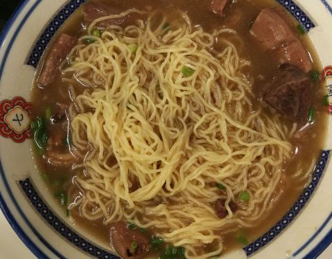 据说刚开时特别火爆,过了风头再过来还是遇上排队。好奇店里并未坐满,为何不让进?观察了一会儿发现似乎是不给拼桌!有没有搞错,就一吃面的快餐店,还这么讲究?! 终于轮上了,点了牛腩面和牛杂面各一份,都是42元。等面的时间仔细看看环境,似乎是怀旧港式风格,不过我对此无感,只要干净就行。面上浇头的量还是挺足的,但吃下来觉得面条本身更好吃。牛腩的瘦肉部分我喜欢,只是略偏老,但肥肉的几块都被我扔了。牛杂一点不好吃,连喜欢牛杂的同伴都觉得做得味道不好。没有二次消费。