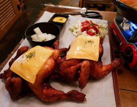 酒和下酒菜 体验传统的韩国文化 朝鲜时代探店来一发~ 有空和小伙伴约了个午饭,于是约在了位于弘大附近的朝鲜时代。 这家店是在地下的,外部的装修就有点厉害,感觉走在了韩国古装剧里,顺着楼梯走下来,入口也是浓浓的朝鲜时代的风情。 店内部的装饰也是过去几百年韩剧里的感觉,还有供拍摄的韩服可以试穿。我们点了米肠汤和炸鸡,没想到炸鸡是完整的两只了,于是乎吃货们就上演了空手吃炸鸡。 米肠汤超级适合下酒吃,味道咸淡适中,也适合冷冷的冬天里来一碗热汤必点的搭配。 炸鸡真的炸的是外酥里嫩的,撕开肌肉鲜嫩的汁水顺着肉划拉开,但是吃起来不觉得腻,就觉得香脆。 他们家还有葱饼等等下酒菜,也很适合晚上来喝酒畅谈。