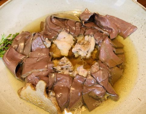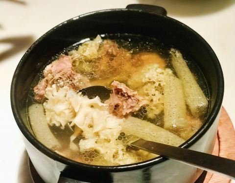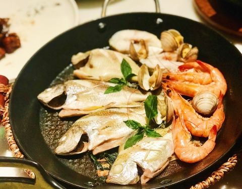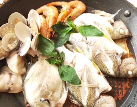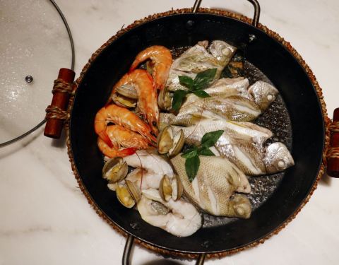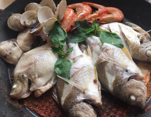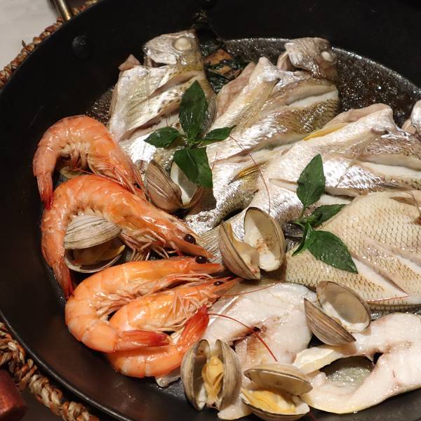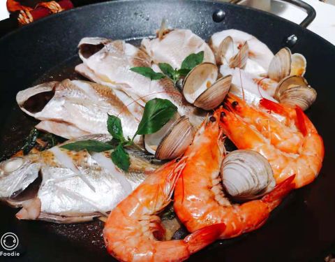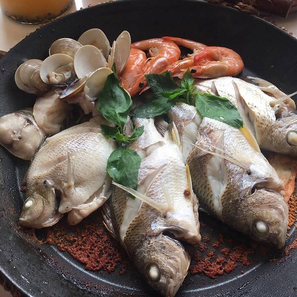 选用时下的东山杂鱼、虾与油蛤,用老姜与盐炝过之后焖锅,直接在铁板上炝熟,撒盐调味上桌。盘中的海鲜各个都是个头硕大,肉质饱满,不需要蘸酱,吃得就是它们的原汁原味,鲜美得不行!