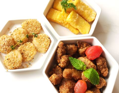 醋肉三拼有醋肉、炸豆腐和糍耙三样小吃,颜值以及口感都很好