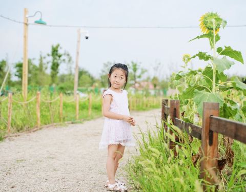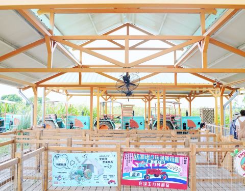 打卡中国首家拖拉机农场,带你撒野带你疯 ⛱中国首家拖拉机主题农场,疯狂拖拉机农场,位于无锡市惠山区阳山镇田园东方田园综合体内,以外星人创造的俏壳、逗皮、朗哞也原创IP,打造中国首家以拖拉机驾驶娱乐为主,集动物观赏、农作物科普及农庄餐饮体验为一体的农场。大朋友小朋友都可驾驶安全有趣的拖拉机在田野中尽情撒野,在丰收的喜悦中寻找等待外星人的再次到来 整个农场可以分为以下几个部分娱乐表演区、景点、和农场娱乐、服务设施项目 娱乐表演主要包含暖阳广场 四季舞台和节日广场,我们去的时候舞台基本都还没有开,所以没有看到表演。 服务设施方面包含光之花房,物资仓库和柴壳的厨房。柴壳的厨房面积很大,有点像谷仓的造型,外面有露天位,晚上可以做烧烤派对还有乐队演出。 厨房内主要提供早餐冷饮和西式简餐。 景点方面主要有地鼠洞,农场主雕塑,田园农作物、小动物后院和风力提水机。带着女儿和三只小猪进行了互动,小家伙们都太可爱了,看起来还蛮干净的,也没有异味,一直和女儿要吃的。她一边喂还一边像老师一样维持秩序,这可是平时在现实生活中难以碰到的。还有一群意气风发的火鸡在笼子里走起了T台,雄赳赳气昂昂。还有几只小羊好像被圈了起来,我们不太方便过去喂养,只能远观而不可亵玩焉了。 最有趣的还要数农场里的娱乐项目!最推荐的就是拖拉机驾驶!在限定轨道上驰骋,只需脚踩油门便可自动运行,完全解放双手,小朋友年龄不限,都可以体验。速度不快,却可以在美丽的向日葵花海中穿行,真是无比惬意! 另外一个必体验项目是卡丁车,这里的卡丁车不是油门操控的,而是需要小朋友们用自己的双脚去提供动力输出,安全性和参与度上又提高了一个层次。场地不是塑胶跑道,而是泥土和麦田,满满乡村田野风,仿佛身在美国加州的农庄!有大型和小型卡丁车两种,车子车座高低远近均可调节,五岁女儿更喜欢挑战大车子,骑的不亦乐乎。不过也苦了我这位老母亲,一直在后面拼命推!其他还有碰碰车,但是这个项目要求孩子必须身高1.2米以上才可以入场哦,我们家不够高,只能在场外为其他小朋友呐喊助威啦 疯狂拖拉机农场:无锡田园东方二期