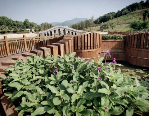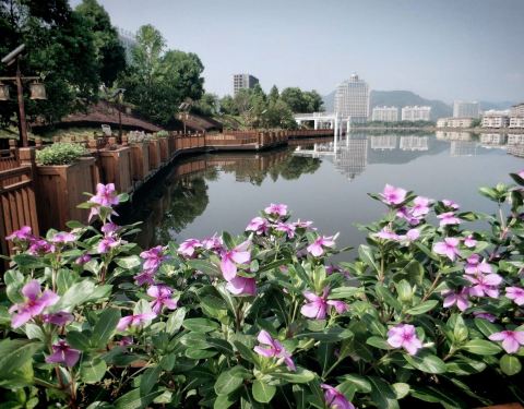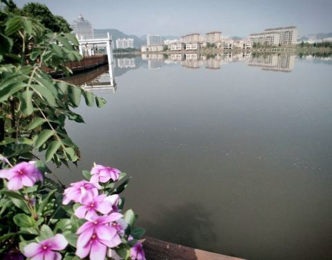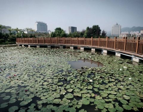 东头步道蜿蜒有致,栏杆上植有花草,可以湖面为背景进行拍照。正在建设中,龙湖被东头小岛分为南北两半