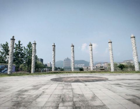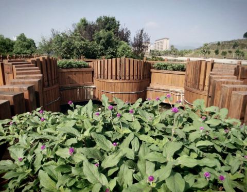 正在建设中,龙湖被东头小岛分为南北两半。东头步道蜿蜒有致,栏杆上植有花草,可以湖面为背景进行拍照。小山上绿化基本完成,有几个工人为树木花草喷水。