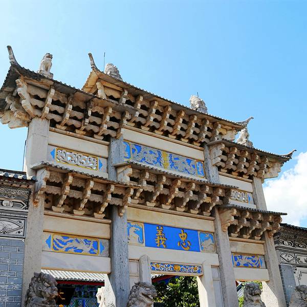 牌坊使用汉白玉雕刻而成,巍峨壮观,为明朝万历皇帝批准建造,上书“圣旨”、“忠义”,所用汉白玉材料采自下虎跳金沙江边,整体建筑庄严大气。