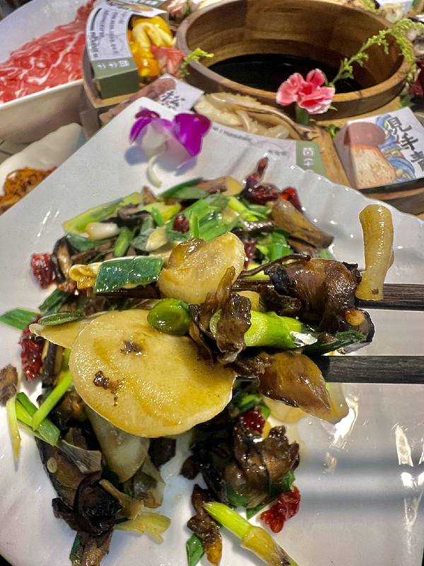 招牌木桶全菌锅仪式感拉满,中间鲜菌汤底咕嘟冒泡,外圈摆满见手青、黄牛肝菌、黄落伞等多种菌子,每款都配介绍卡,新鲜度肉眼可见。店员会提醒煮制时间,安全又贴心。开锅先喝原汤,无多余调味,全是菌子自带的山野清香,温润鲜甜,一口治愈疲惫。涮完菌子再下肉片,吸饱菌汤后嫩而不柴,鲜味翻倍。