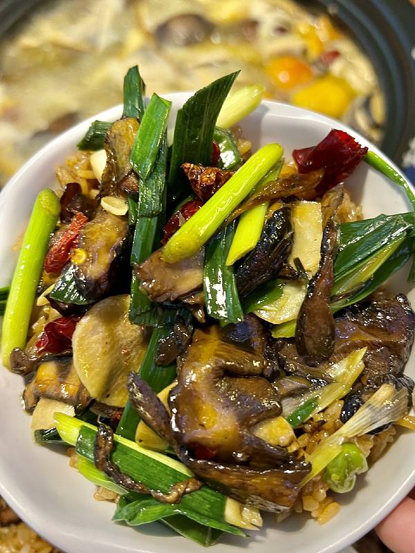 菌香焖饭必点,米饭油亮软糯,混着菌丁、豌豆与胡萝卜,菌香浓郁入味,粒粒挂汁,空碗都想舔干净,妥妥炫饭神器。爆炒见手青火候到位,锅气十足,葱香与辣香激发菌子鲜醇,下饭一绝。民族风竹编杯装的酸角汁酸甜解腻,颜值与口感双在线,搭配菌锅刚刚好。