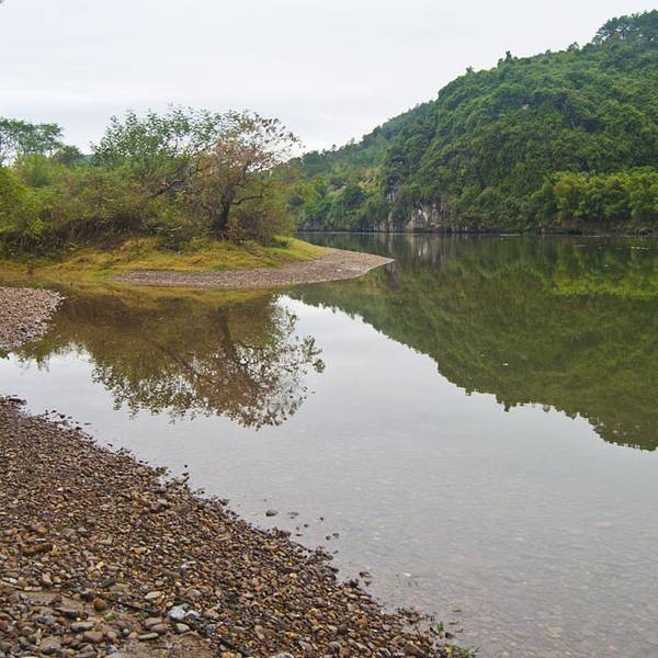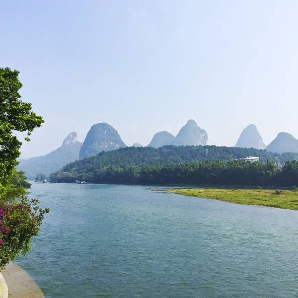 从西街靠近漓江的口出来后,面朝漓江左转进入滨江路,后逆着漓江水流方向沿江边的路一直走,中途经过迎宾画廊、龙头山码头及几个小村庄后,即可到达