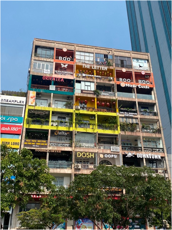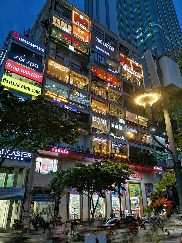 太阳下山了,温度也没这么燥热,主要是太阳不晒了,我们从酒店出发步行到网红打卡地--咖啡公寓。咖啡公寓一栋由老宅翻修改造的咖啡公寓The Cafe Apartment,聚集了50多家风格各异的咖啡馆,是咖啡迷品味慢生活的休闲地点。我们其实对这种网红地不是很感冒,因为一会去吃晚饭的店正好顺路,而且咖啡公寓也在胡志明广场和市政厅的附近就顺道来看一下,晚上咖啡公寓的广告灯箱都亮了起来,还是很有文艺气息的。