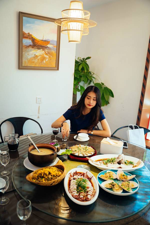厦门让我心心念念的美食,就是海鲜了,正好客栈定在了黄厝海边,便在附近搜寻着好吃的海鲜餐厅。热情的客栈前台跟我推荐了这家海渔家餐厅,放下行李便过去吃午饭了。这家餐厅真是这趟厦门旅途中的宝藏,交通便利,餐厅很大,环境也很好,浓浓的闽南渔家风情,还有设立包间。超出了我对渔家餐厅的想象~要不是中午太阳有点大,我跟芒果都想坐在外面的露台吃饭了!夜晚的时候吃着海鲜吹着海风,该是一件多么惬意的事!(芒果拍的做作的我哈哈哈哈)话说回来,这家海鲜真的不错,分量足而不贵,海鲜及其鲜美,烹饪方式大多从简,还原了海鲜最本真的那一份鲜甜。鱼肉超级肥肉鲜美,调料简简单单,我跟芒果却被这个鱼肉本身的鲜嫩惊艳到了!一点腥味都没有,对半切的鱼肉甚至不用挑刺,芒果不怎么喜欢吃鱼,也吃了好多哈哈哈~粉丝跟海鲜真的好搭小管Q弹可口,一条小管足足有盘子那么长!炒饭松散可口,粒粒分明,干而不柴,这种干香味道的米饭真是我的最爱~乳白色的鱼汤,不用多说就知道营养满满!女孩子要多补偿点营养和胶原蛋白才能美美哒~所以芒果跟我都喝了超级多~吃饱饭后跟芒果超级满足的回到酒店休息啦!