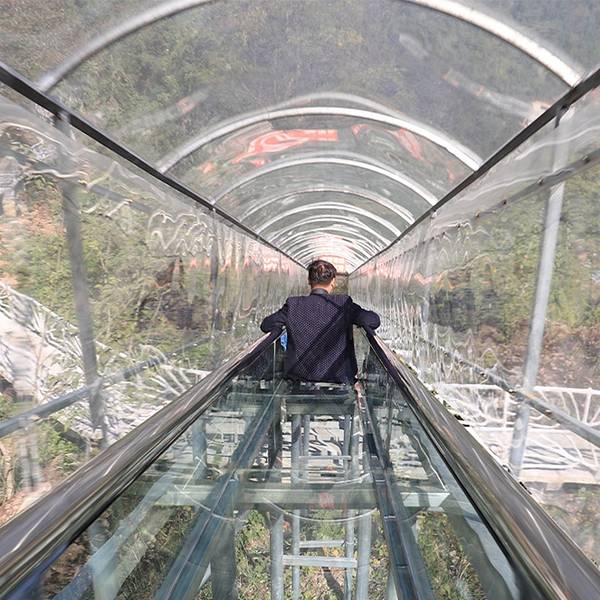 云台山风景区的玻璃滑道,是湘中首条全透明高空纯玻璃滑道。纯玻璃的设计,非常的高端炫目,玻璃滑道隐身在云台山风景区的茂密森林中,无论是行走在林中,还是滑行其中,都可欣赏到两旁美丽的树木丛生景观。
