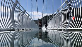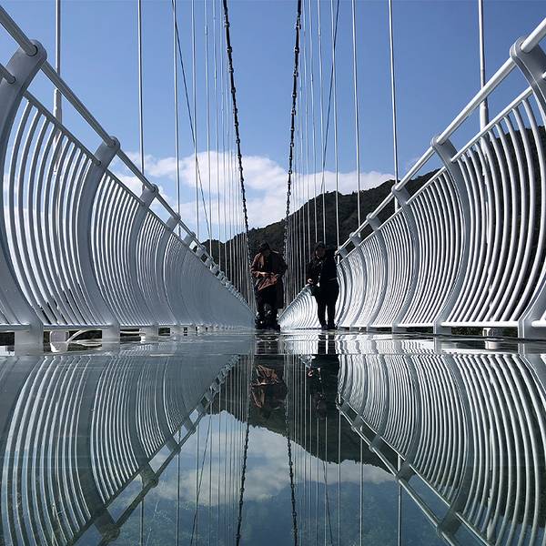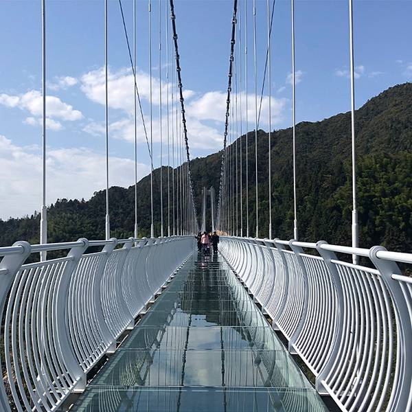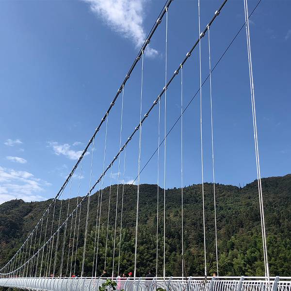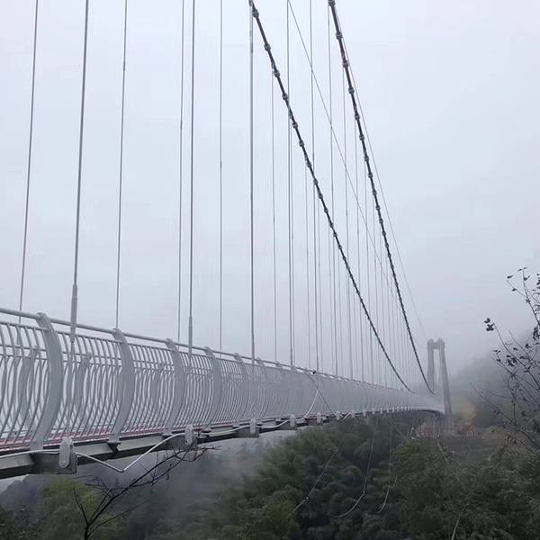 玻璃吊桥位于云台山神仙岩风景区,是一座人行观光玻璃天桥,采用单跨布置,结构形式为高架索桥,设计总跨为315m,主跨长约212m,横梁总宽为3m,人行道净宽2m。