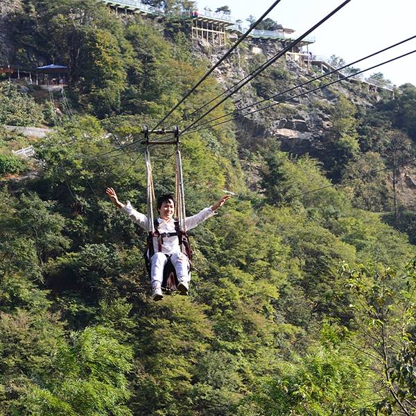 人在玻璃滑道滑行时就像在森林中穿梭一般,这种滑行的感觉让人充满紧张与刺激,穿戴特制的滑垫裤和手套,自己随心所欲控制速度,在滑道中既可快如闪电,又可缓慢滑行,刺激又安全~4.高空滑索