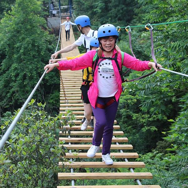 云台山拓展项目丛林穿越分别由钢丝桥、铁链桥、木板桥三个部分组成。第一关为钢丝桥,长度62米;第二关为铁链桥,长度为35.7米;第三关为木板桥,长度为61.2米。