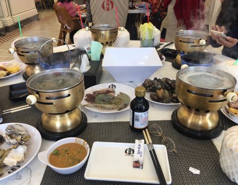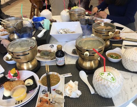 主打海鲜火锅,位于西南四环,开车去比较方便,有非常大的地上停车场和地下停车场,在此就餐全部免费停车。有包间,不过大堂环境也很舒适。海鲜非常新鲜,牡蛎、鲍鱼、各种螃蟹,龙虾,鳄鱼肉等等都是生猛的,而且足量供应!不存在断档现象。最爱是新鲜椰子汁和烤榴莲,纯正鲜椰子和榴莲果肉哦……!午餐每位238,晚餐268,相对比较值得一试!