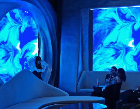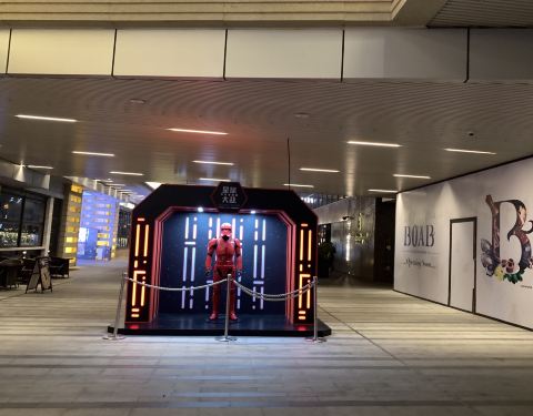 中海环宇荟位置其实是在黄陂南路与平时的马当路之间,应该说处在闹中取静的下沉式美食城。这里除了餐厅、咖啡厅,甜品店,健身品牌店,还有盒马生鲜超市,这个超市给市中心居民带来了方便。最显眼的是科幻片宣传...