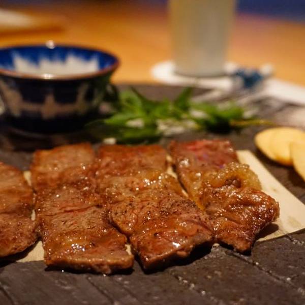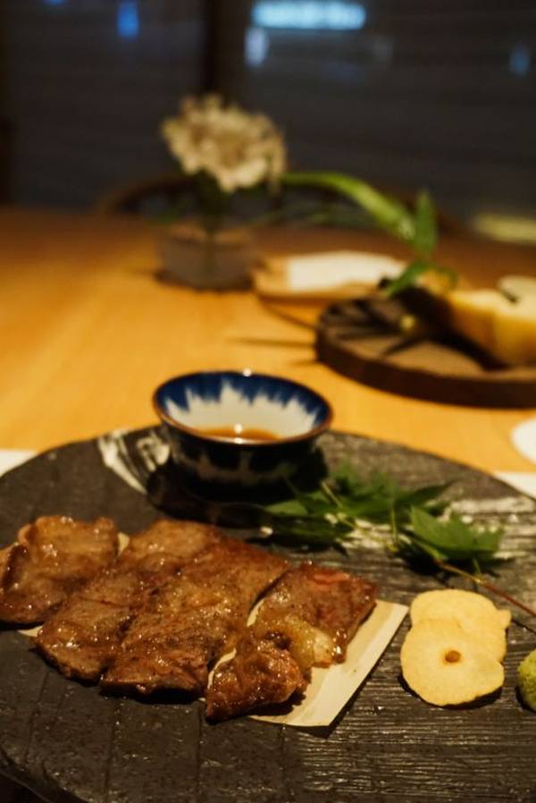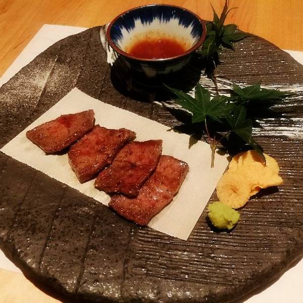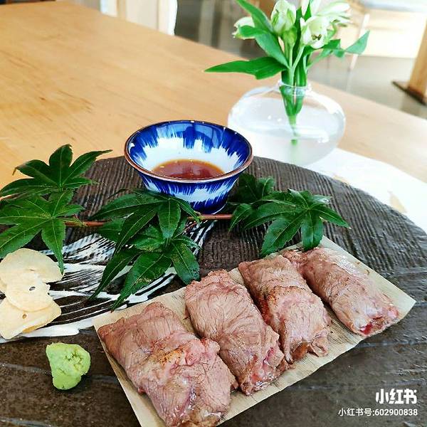 |澳洲和牛薄烧^和牛切成薄片,牛肉片煎至五成熟,带一丁点的红血丝,此时的肉特别嫩滑,口感很棒。还可搭配蘸酱,芥末或淮山片。如果怕太生的朋友可以嘱咐煎熟一些呢。[愉快]