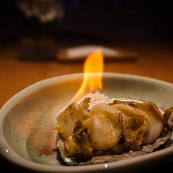 |火炙鲍鱼^将大鲍鱼切成薄片,以火现烤,端上餐桌时火苗还未熄灭,摇曳生姿。火苗一熄就迫不及待伸出筷子,夹取一片还晶莹剔透的鲍鱼片品尝,仿佛味蕾突然绽放烟火般欣喜,这滋味实在美妙!