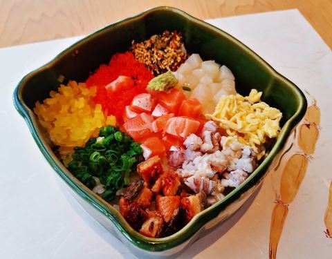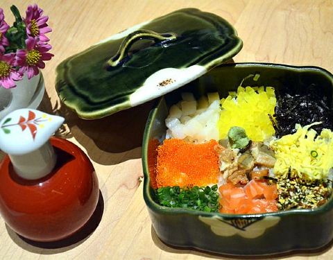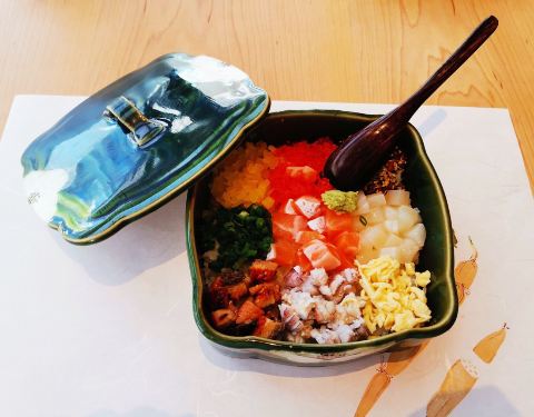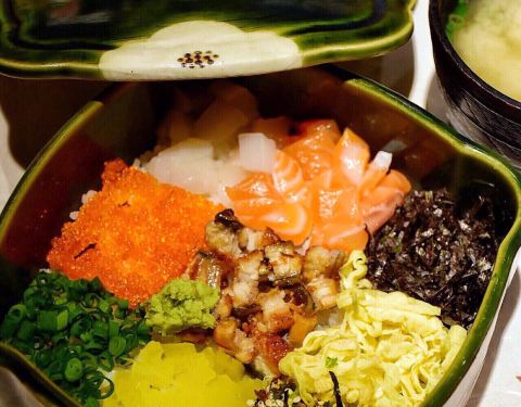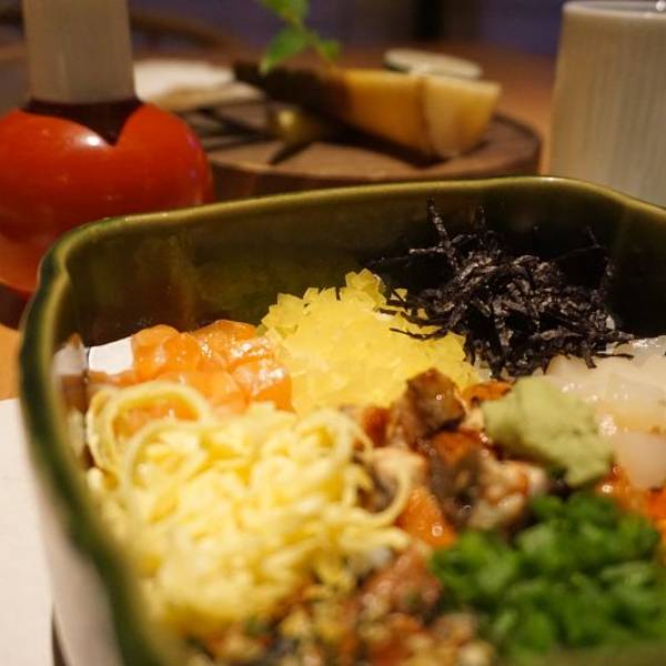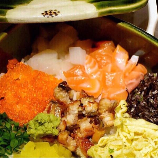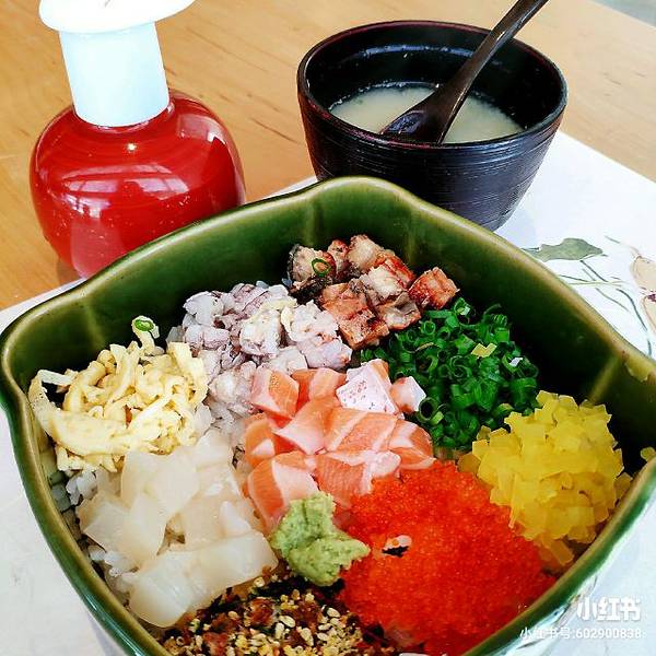 |九宫格御饭^令人惊艳的主食,米饭上整整齐齐铺着九种配料,包括三文鱼、鳗鱼、虾菇、帆立贝等,和芥末一起搅拌,再根据个人口味轻重加入适量酱油继续搅拌均匀,然后就可以享用了~每一口都是天堂般的享受,口感极其丰富,欲罢不能~