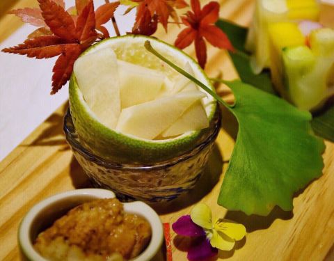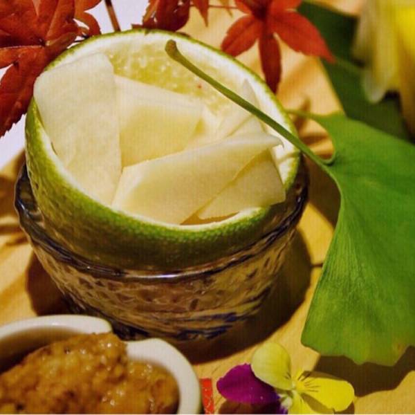 「星鳗竹笋蔬菜卷」很神奇的一个搭配,装笋块的容器居然是橙子。