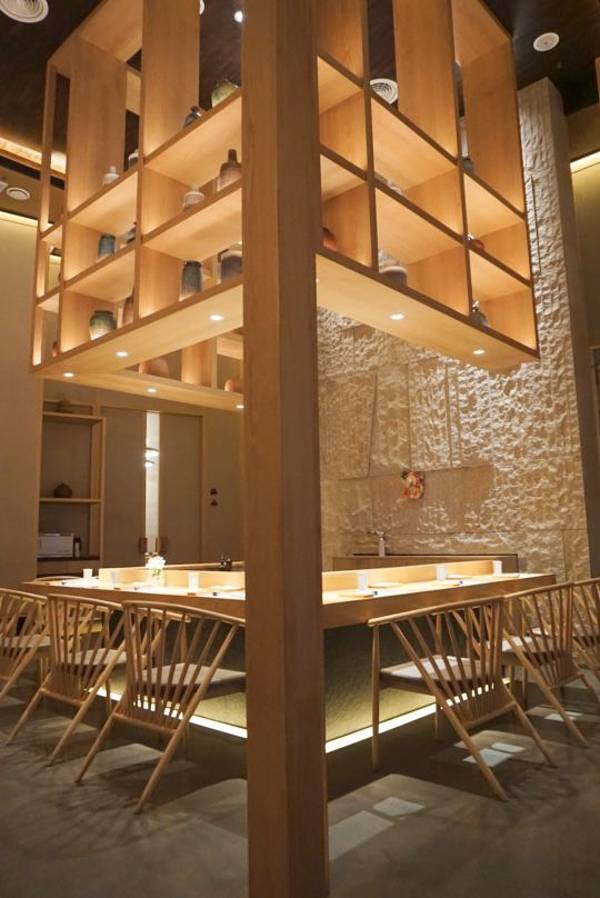 宝龙一城五楼露天花园,如果不走运还得晒点太阳。报了预约的手机号以后被店员温柔地迎了进去,挑了一个舒适的靠窗座位。当然,喜欢近距离迎接美食诞生的可以选择吧台观赏大厨的表演,喜欢安静的可以选择半包厢。空调冷气挺足的,工作日中午人不多,服务质量一级棒!