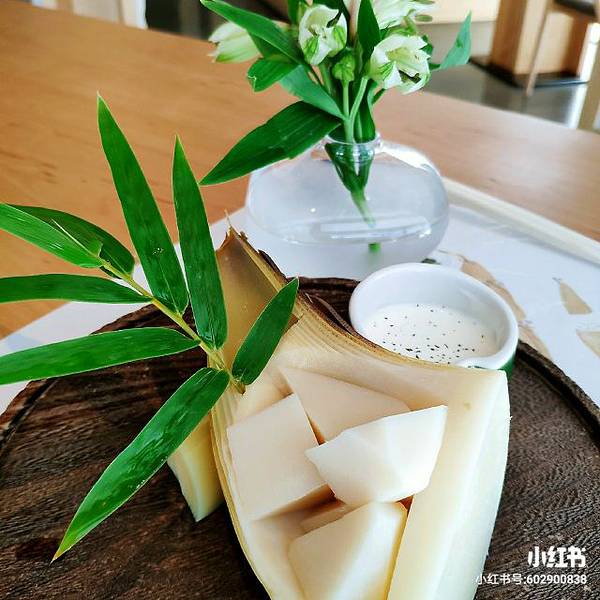 |绿竹笋沙拉^搭配的是梅奶汁 ,绿竹笋鲜嫩多汁 ,绿竹笋切块过水捞一下,所以保留了竹笋的原味,清甜中带点微微的苦,特别特别的嫩,大爱。